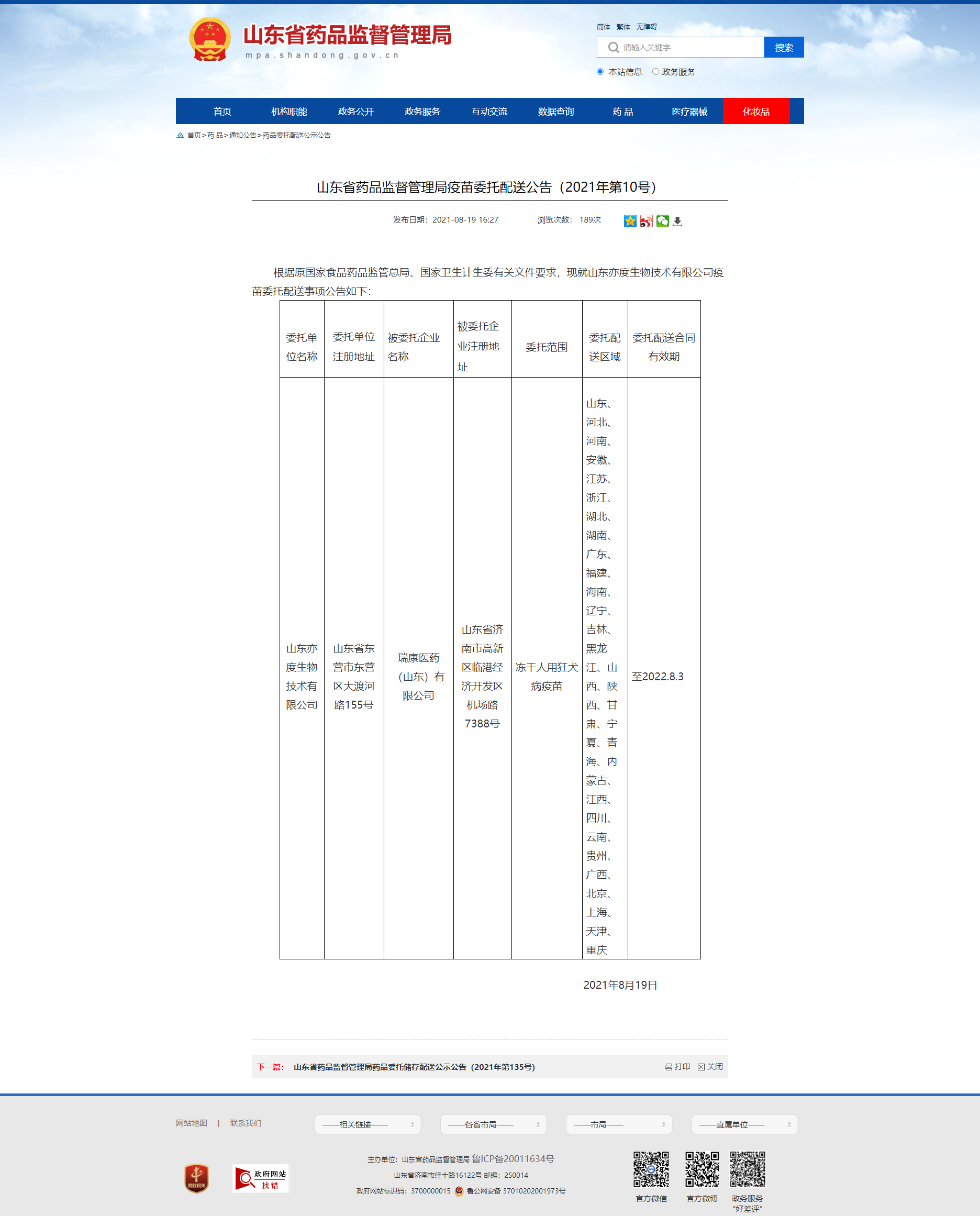 疫苗生產(chǎn)企業(yè)(非免疫規(guī)劃疫苗)委托儲(chǔ)存配送情況報(bào)告信息公示_山東省藥品監(jiān)督管理局